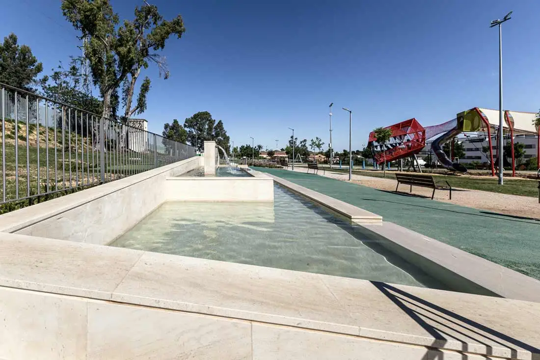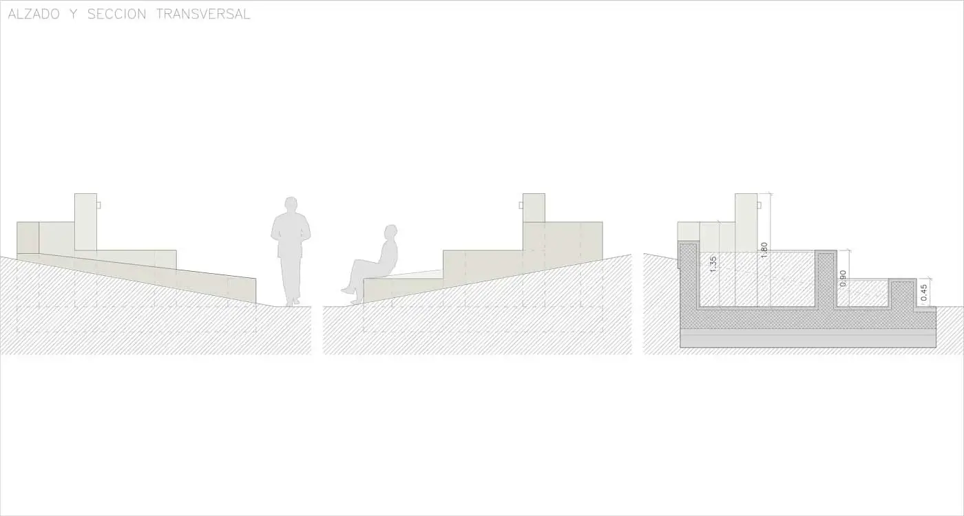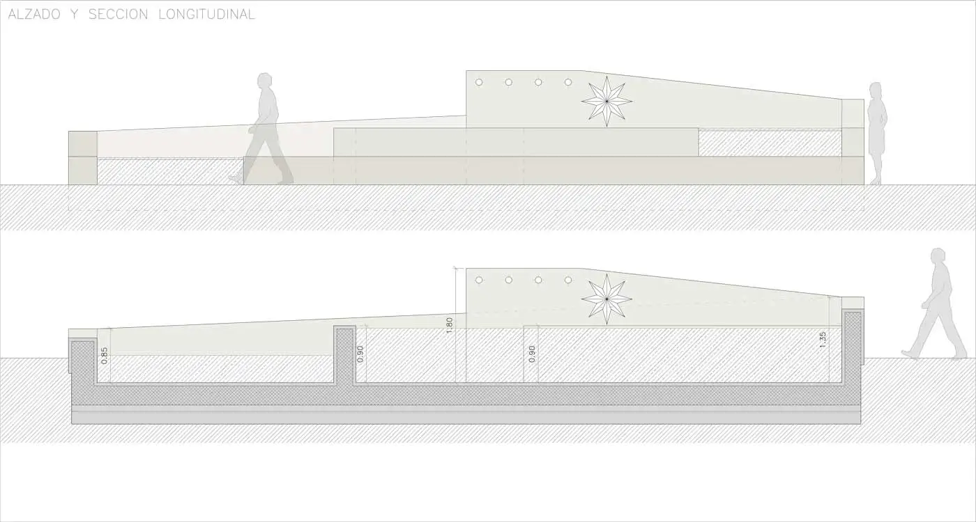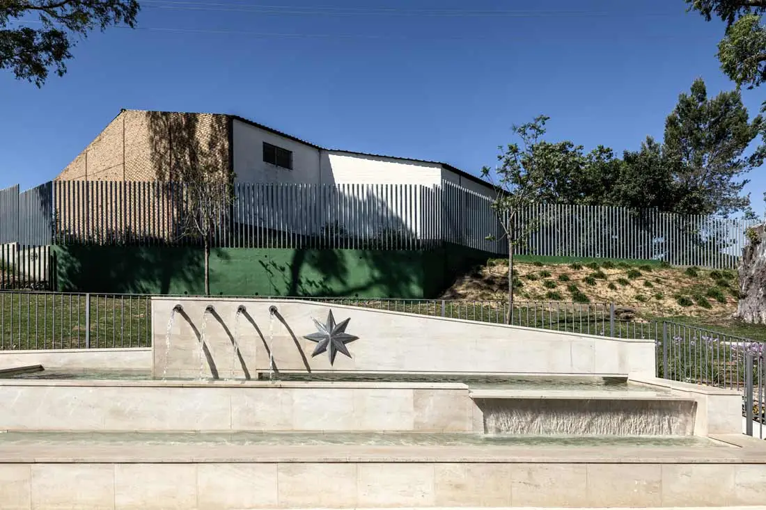 El proyecto realiza una reinterpretación de estos elementos en los que el aporte de agua se realiza mediante caída desde uno o varios chorros en el paramento vertical hacia el lado largo una zona de estanque rectangular que funciona por rebose, gesto que se repite en los dos vasos que forman la fuente quedando el final del circuito de agua a la altura de la solería exterior acentuando su relación con los pilones.