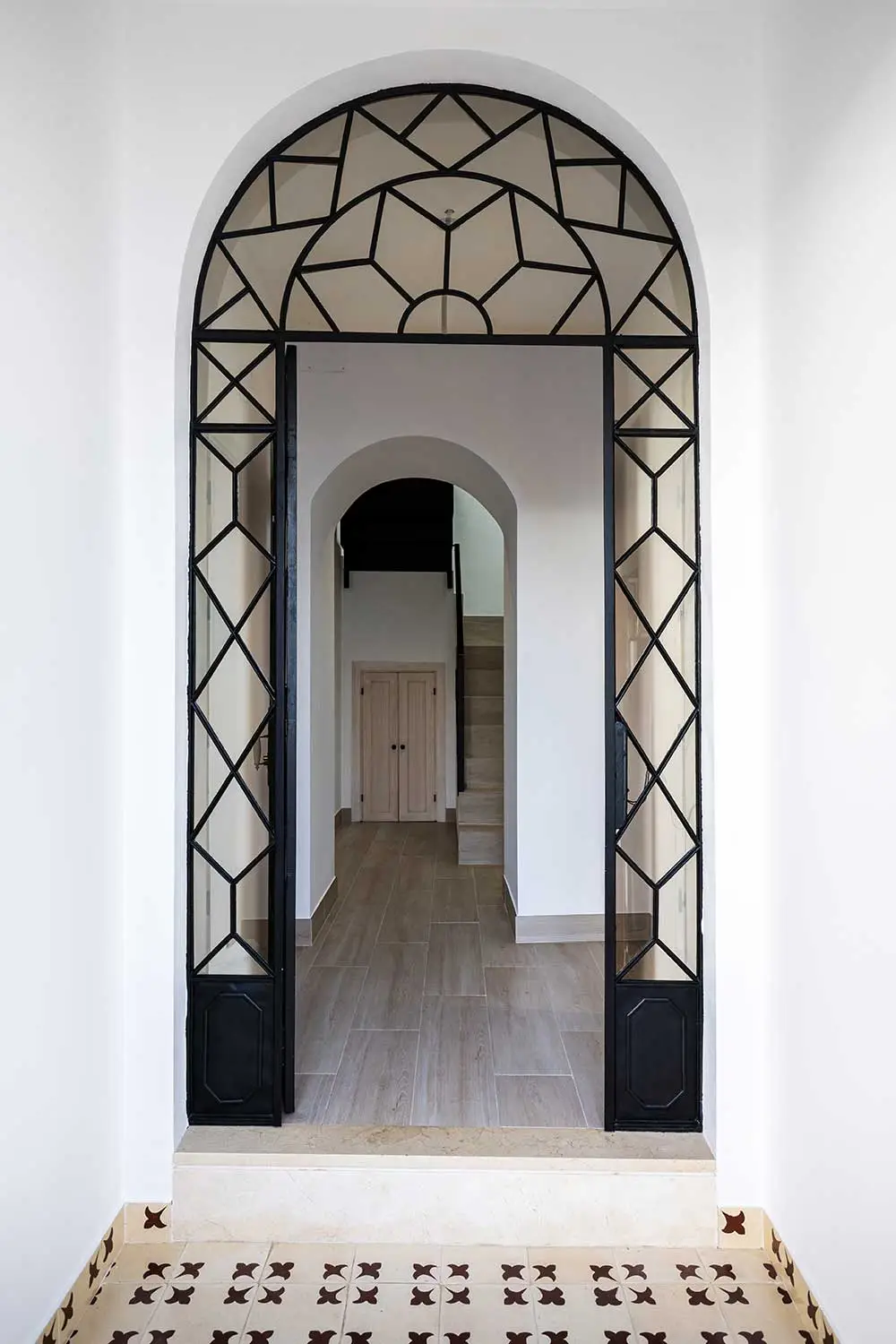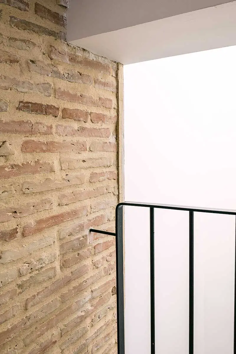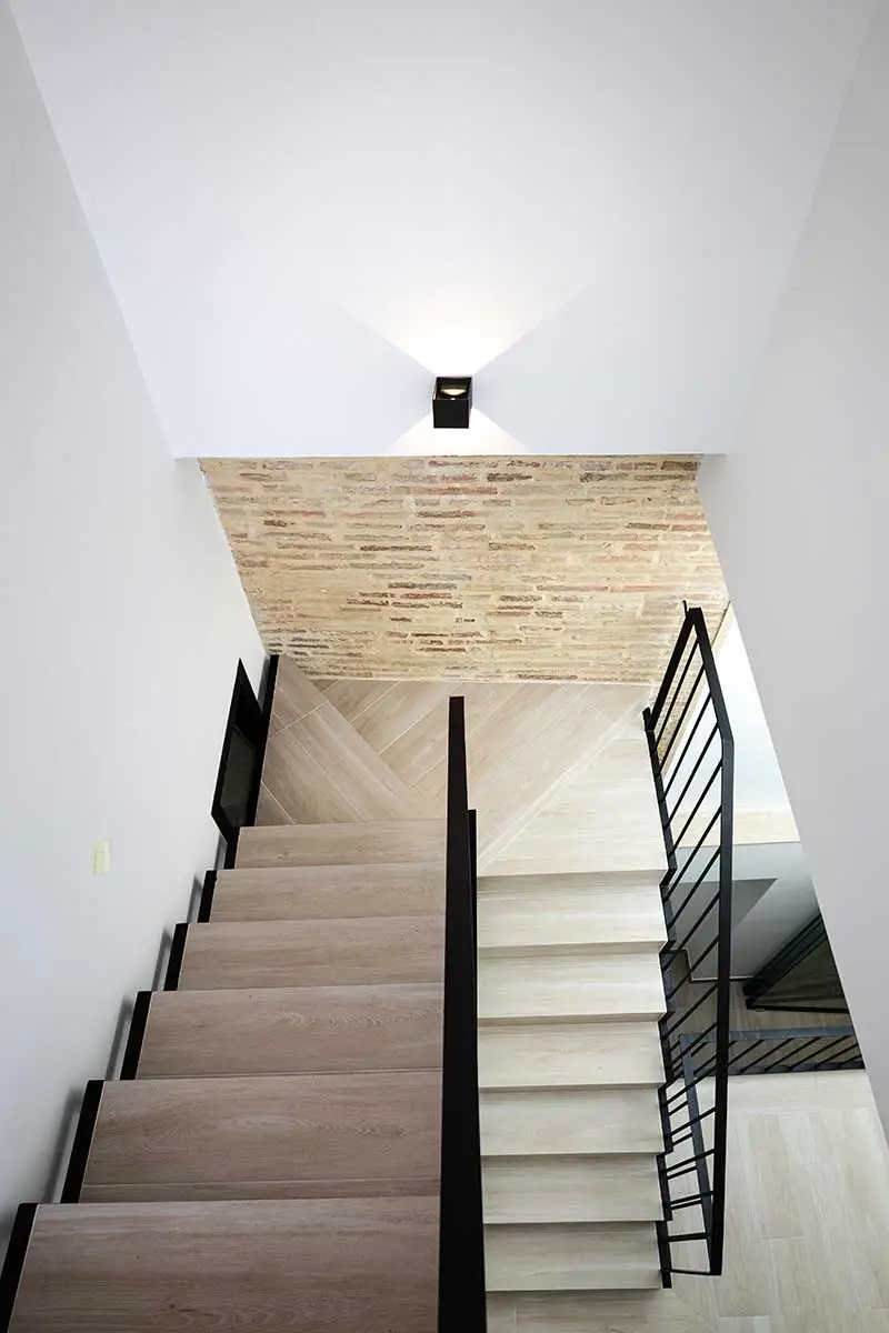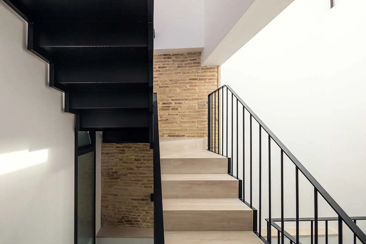 En la crujía interior para dar cabida a las necesidades habitacionales actuales se ejecuta una reforma morfológica de gran calado. La actuación de mayor envergadura consiste en llevar la escalera al fondo del inmueble, junto con los baños, consiguiéndose así que la zona ciega de la casa albergue los usos de menores necesidades de iluminación natural. Se libera la zona central, que junto a la apertura de un hueco en el muro en la zona del salón, permite crear un espacio fluido mucho más contemporáneo en torno al que se distribuyen las circulaciones de la vivienda, sin dejar de lado las características tipológicas originales del edificio.