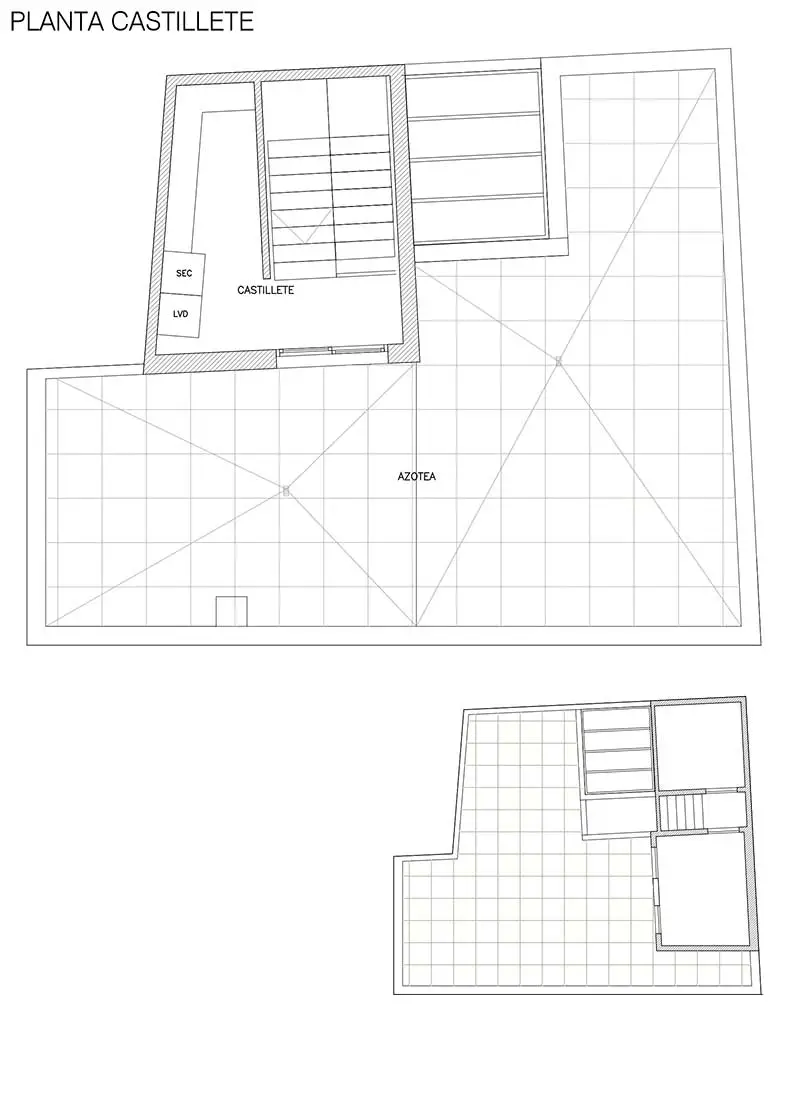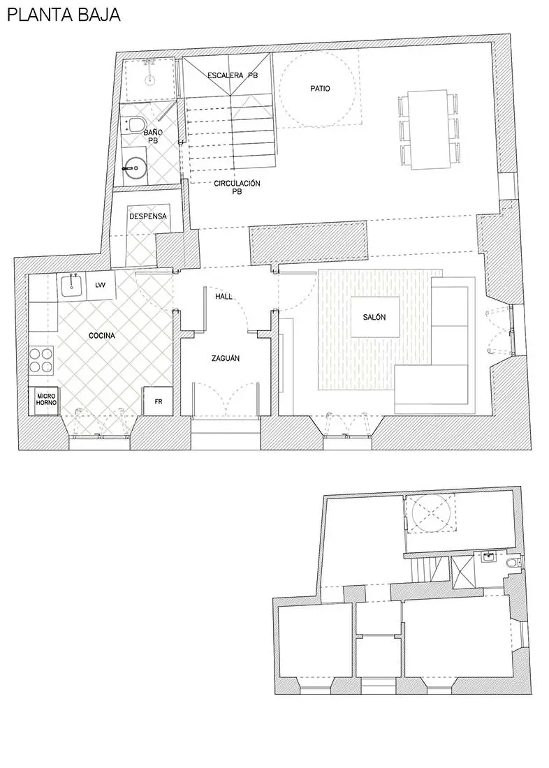 La forma del patio permanece intacta con la actuación, pero con el añadido de que la galería de primera planta y la escalera se abren a él. El patio trasero y pequeño que tenía poca utilidad se pone en valor, siendo una de las piezas centrales de la casa en torno al que aparecen el acceso a la vivienda, la escalera y el pasillo de planta primera que ahora se convierte en galería.