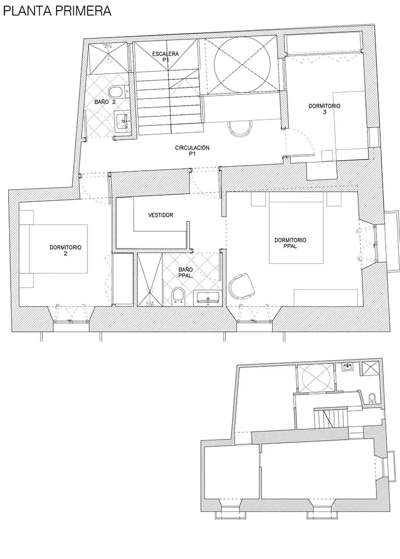 Rehabilitación de vivienda donde el mayor peso de la actuación recae sobre la segunda crujía, de mucho menos valor patrimonial, manteniéndose en primera crujía casi intacto el sistema estructural, de compartimentaciones y huecos.